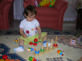 Geçenlerde bir oyuncakçı dükkanında gördüğüm bu oyuncak çok ilgimi çekti ve hemen aldım. Renkli halkaların dizildiği ahşap bir oyuncak. Yaren bu aralar epey bir ilgi gösteriyor ancak oyun şeklimiz biraz farklı. Tüm renkli halkaları kucağına toplayarak oynuyor. Ahşaptaki kulelere dizdiği ise sadece halkaların üstüne konulan kafalar.